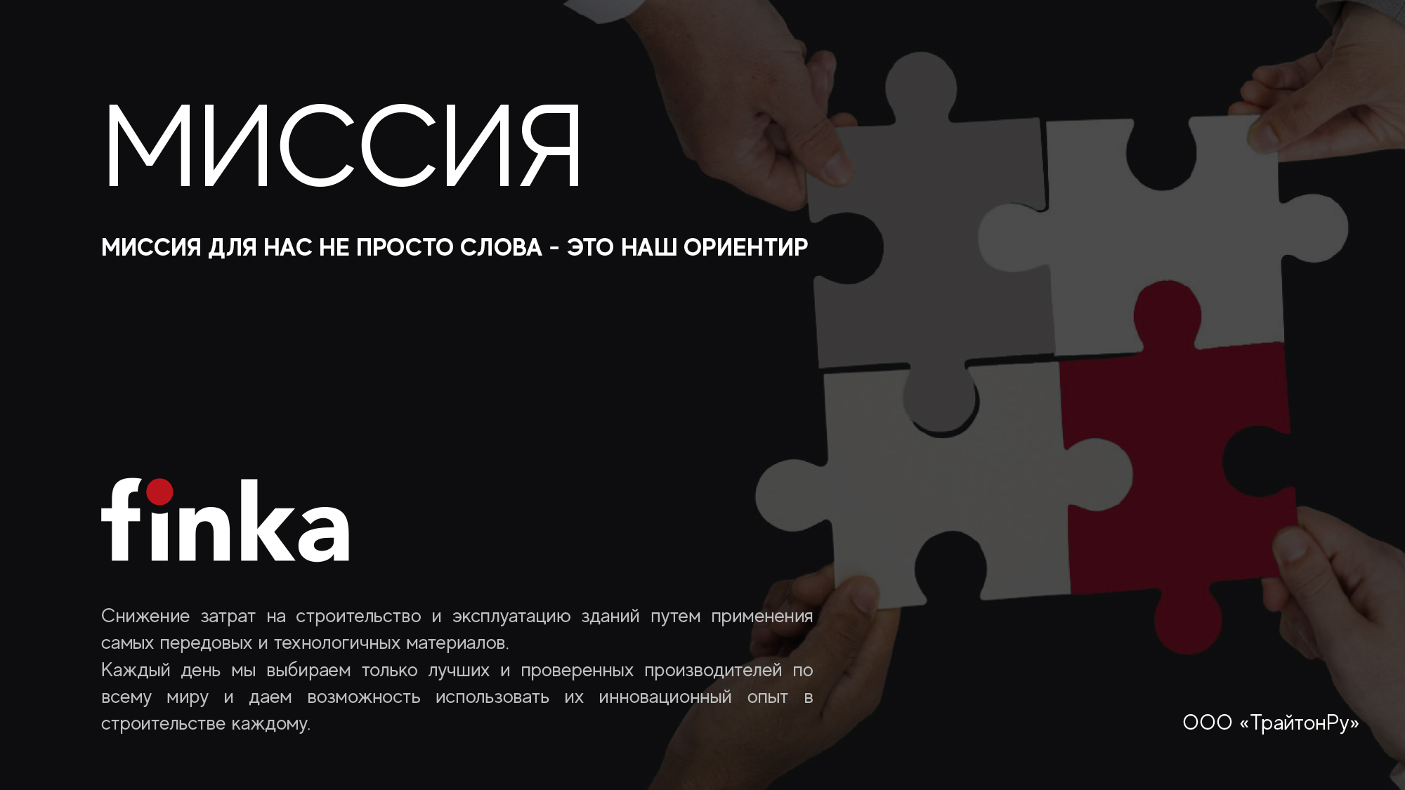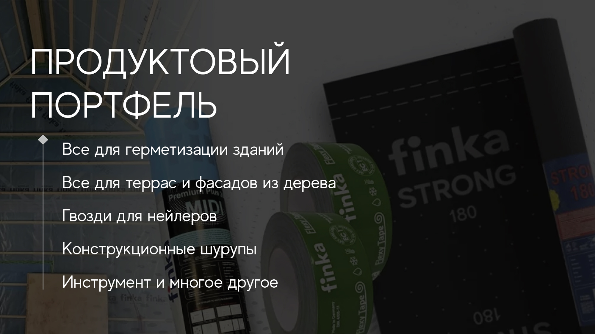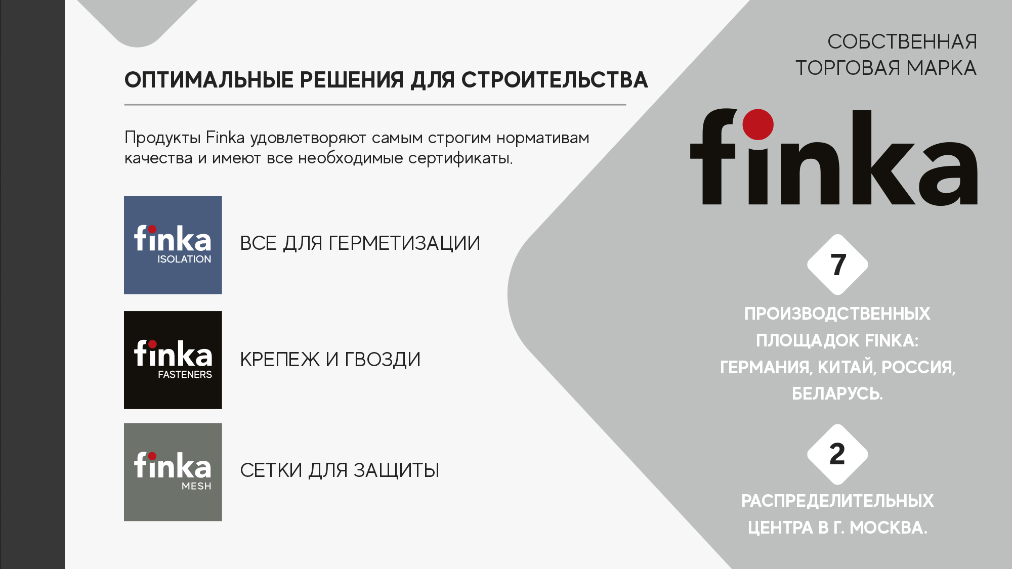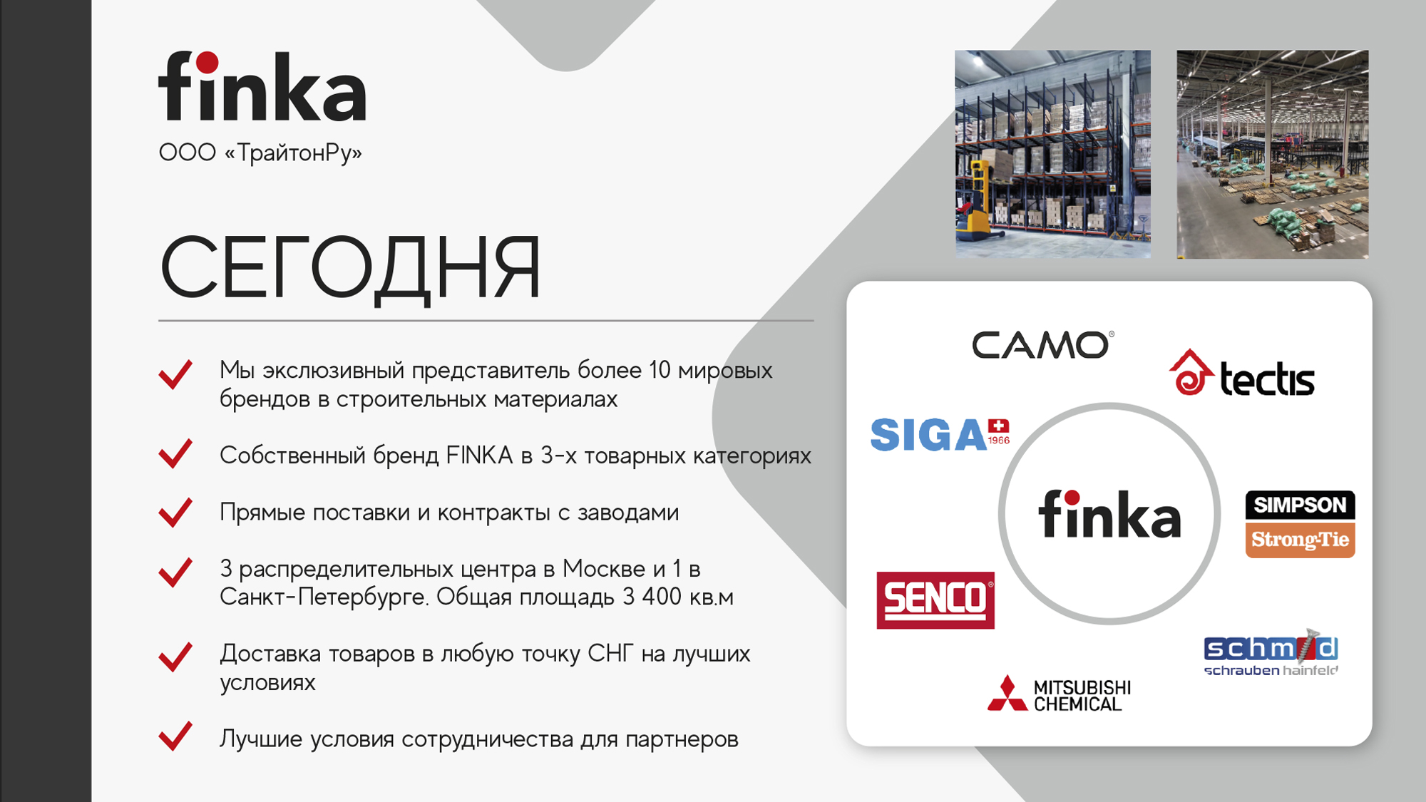Мы первый импортер таких известных строительных брендов, как Tectis, Camo, Siga, Senco, а также производитель и правообладатель бренда Finka.